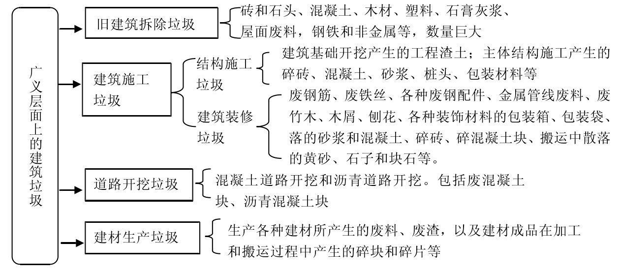 國(guó)內(nèi)學(xué)者對(duì)建筑垃圾給出的定義,把建筑垃圾分為六大部分,包括建筑物拆除下來(lái)的磚;舊建筑拆除后不能再使用的廢棄部分;建筑物施工過(guò)程中產(chǎn)生的廢棄物,如未用完木材、落地砂漿、混凝土、金屬制品、鋼筋頭、鋼材、塑料制品、小五金等;建筑物施工中開(kāi)挖基礎(chǔ)的基坑土、邊坡土或碎石等;家庭裝修過(guò)程中產(chǎn)生的各類廢料;道路翻修產(chǎn)生的廢料。