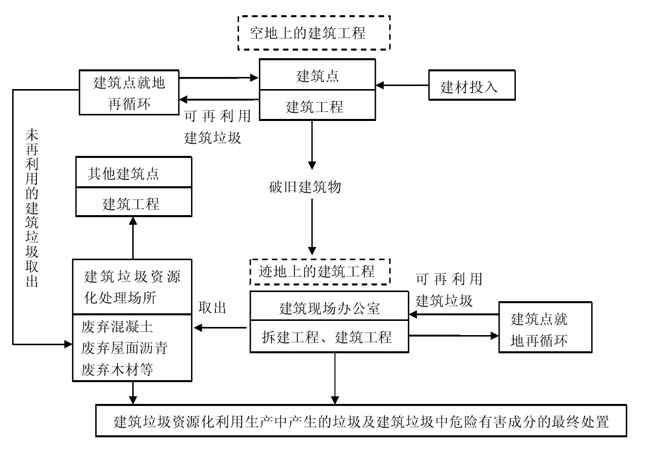 圖中,空地新建建筑施工垃圾的現(xiàn)場(chǎng)再利用可以通過不同施工階段產(chǎn)生建筑施工垃圾的交叉循環(huán)利用來實(shí)現(xiàn),即:將施工現(xiàn)場(chǎng)生成的可再利用建筑垃圾,投入到施工過程的其他子階段中加以利用。